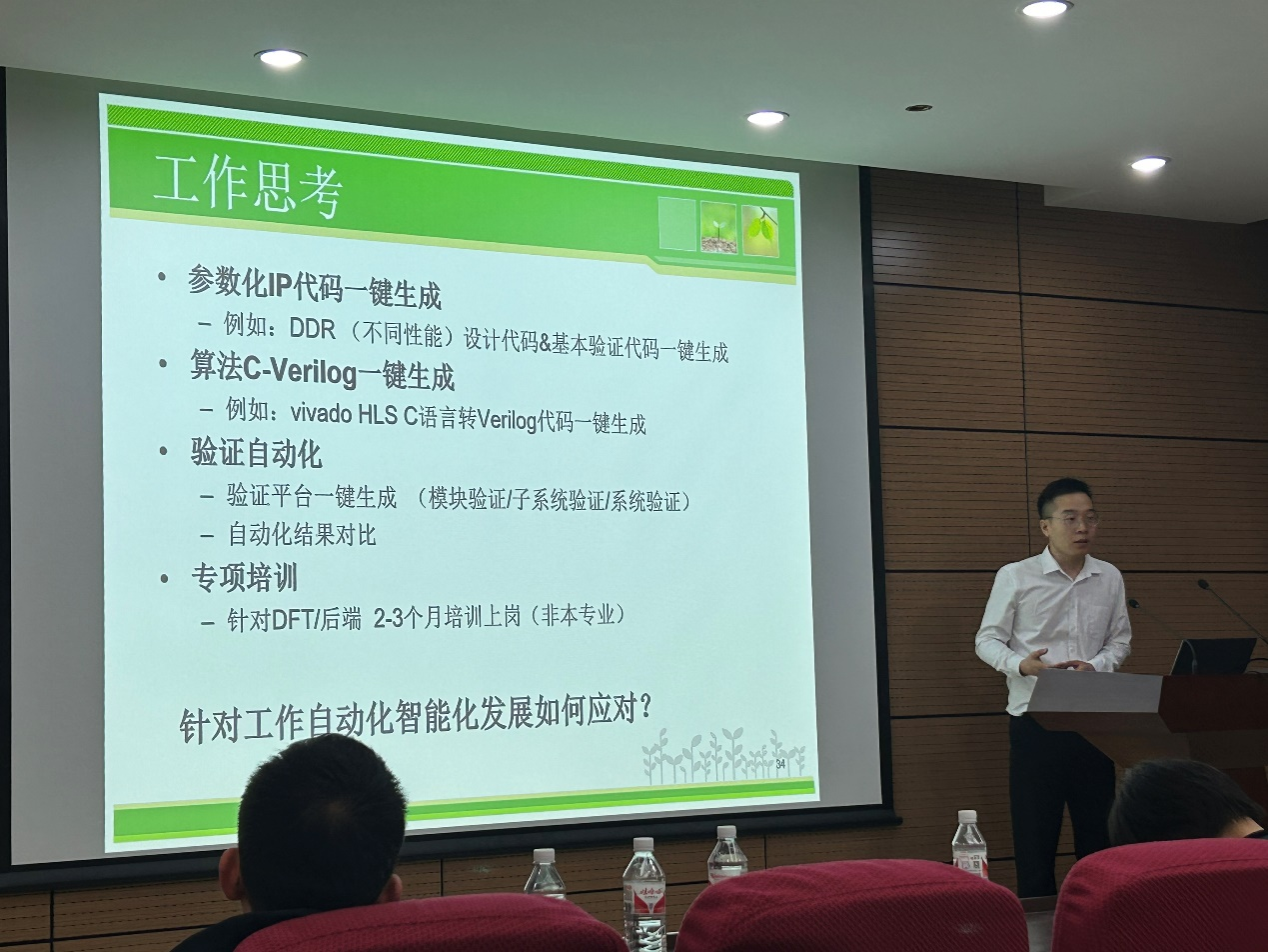 报告中,张毅聚焦芯片研发流程中的前沿技术,首先介绍了芯片架构/设计/验证等环节所涉及的基础知识,从芯片研发公司的视角对关键技术进行了解读,深入阐释了商业化前沿技术并探讨了如何应对自动化智能化的趋势,最后张毅与在场师生特别分享了个人对于芯片研发工作的思考,并鼓励在校的学弟学妹们要不断学习新知识,关注产业动态,从广度和深度上拓展自己的知识技能。
